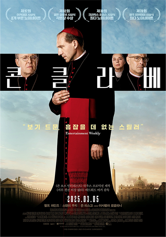 Conclave(2024) 바티칸의 비밀스러운 의식, 콘클라베. 새 교황 선출을 앞두고 유력 후보들의 추악한 비밀이 드러나며 교회는 위기에 빠진다. 로렌스 추기경은 신앙과 현실 사이에서 고뇌하며 교회의